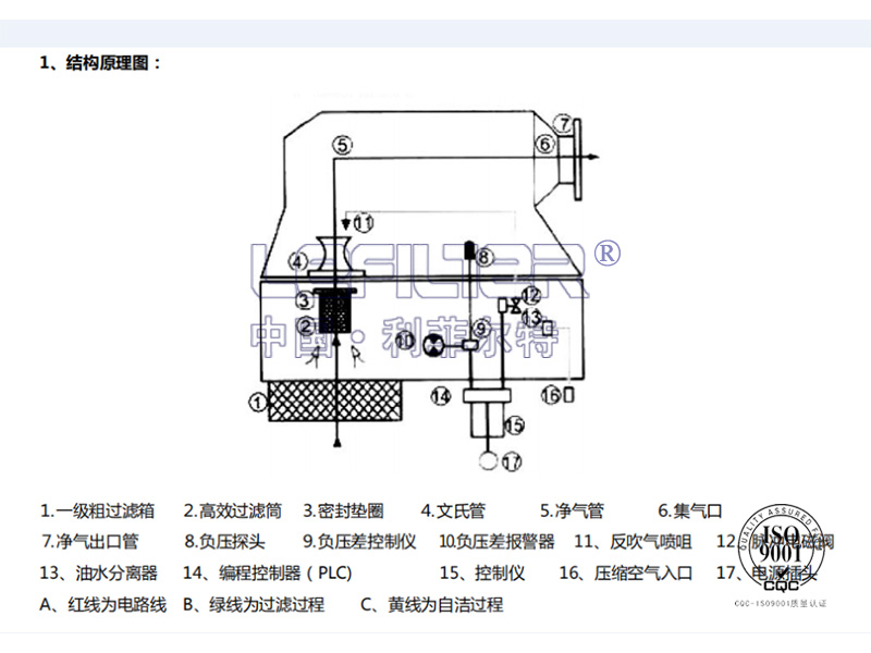 過濾過程: 含塵空氣經空氣壓縮機吸氣作用,從一級粗過濾箱①吸入,經過高效過濾筒②,由于重力慣性、擴散、接觸阻留等綜合作用,塵埃被吸附在高效過濾筒上,潔凈空氣通過密封墊圈③進入文氏管④到凈氣室⑤匯合到集氣口⑥再從凈氣出口管⑦被空壓機吸入。